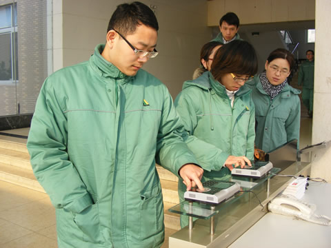 日前,公司新上的指纹识别系统正式投入运行。该系统主要包括指纹机及附属设备。指纹机以采集的指纹辨识人员身份,对办公区的考勤统一管理,也进一步规范了外来人员出入公司的秩序。(图为员工打指纹下班)