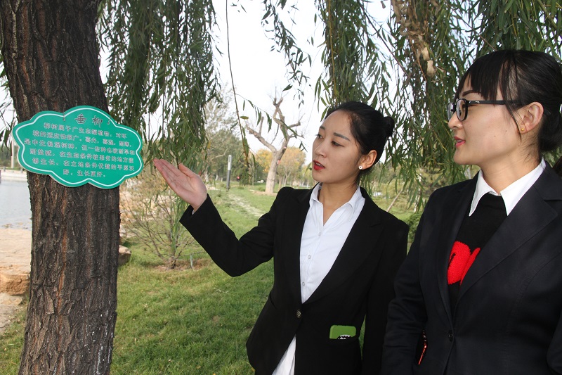 正式的“身份证”。制作的形式多样、颜色各异的铭牌,内容涉及苗木名称、特点、生产习性等,引员工驻足。(图为员工查看新制作的树木“铭牌”)。